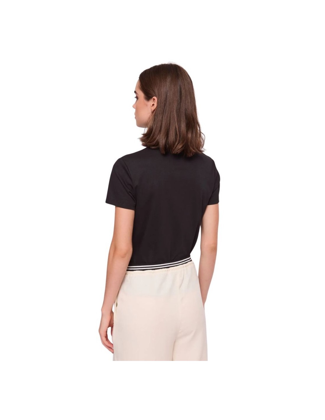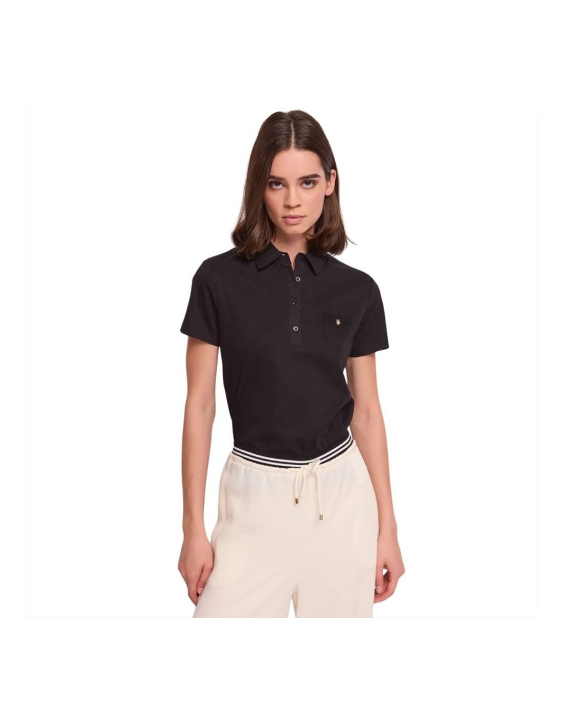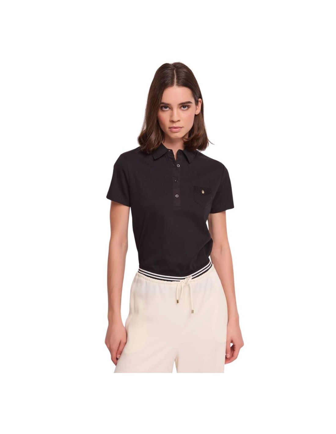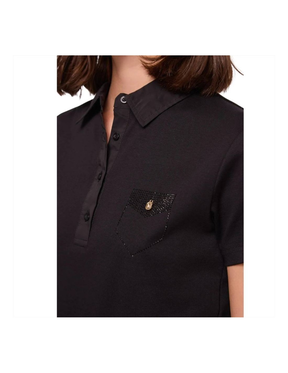 Gaudi Polo da donna in jersey di cotone con dettagli in popeline, strass e charm gioiello sul petto