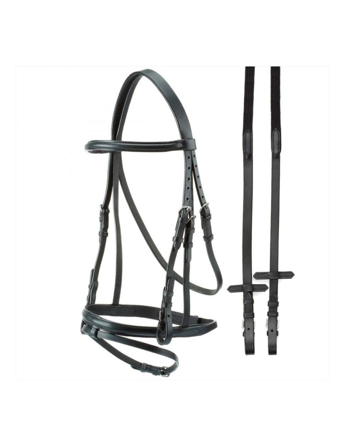 Tattini testiera con frontalino e capezzina inglese in cuoio piatto e redini di tela, fibbie acciaio inox